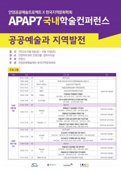 행사는 이틀간 진행되며 공공예술과 지역 관련 심층 연구 사례를 발표하고 토론하는 형식으로 진행된다.