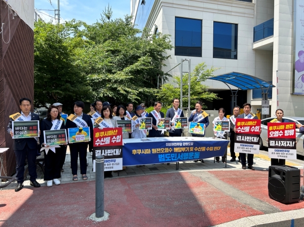 [금요저널] 더불어민주당 춘천철원화천양구 지역위원회 는 7 일 오후 1 시 춘천시 온의동 풍물시장에서 ‘ 후쿠시마 오염수 방류 및 수산물 수입 반대 춘천갑 지역위원회 서명운동본부 발대식 ’ 을 개최했다.