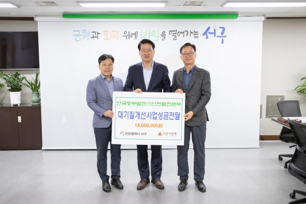 [금요저널] 인천 서구는 한국중부발전 인천발전본부가 지난 7일 대기질 개선사업으로 저소득 가정 친환경 보일러 지원 사업비 1천5백만원을 전달했다고 밝혔다.