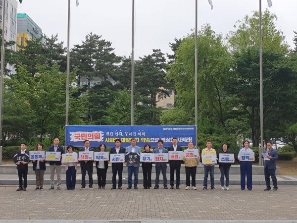 조정식 민주당협의회 대표는 “지금까지 국민의힘과 박광순 의장은 사과와 재발방지 약속에 대한 어떠한 입장표명도 없다”며 “심지어 박광순 의장은 야당이 의회에 들어가지 못하고 있는 상황에서도 양당 합의를 위해 노력하기는 커녕 제282회 정례회 1차, 2차 본회의를 여당 단독으로 개회함으로 철저히 민주당을 무시했다”며 실망과 분노를 들어냈다.