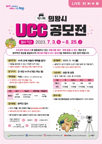 접수 기간은 7월 3일부터 8월 25일까지며 응모 방법은 본인의 유튜브에 출품작을 게시하고 의왕시청 홈페이지 ‘소통참여-신청접수센터-제12회 의왕시 UCC 공모전 신청’에 참가신청서를 제출하면 된다.
