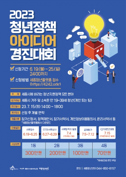 [금요저널] 세종특별자치시가 ‘청년이 그리는 세종의 미래’라는 주제로 열리는 ‘2023 청년정책 아이디어 경진대회’에 지원할 참가자를 오는 25일까지 모집한다.