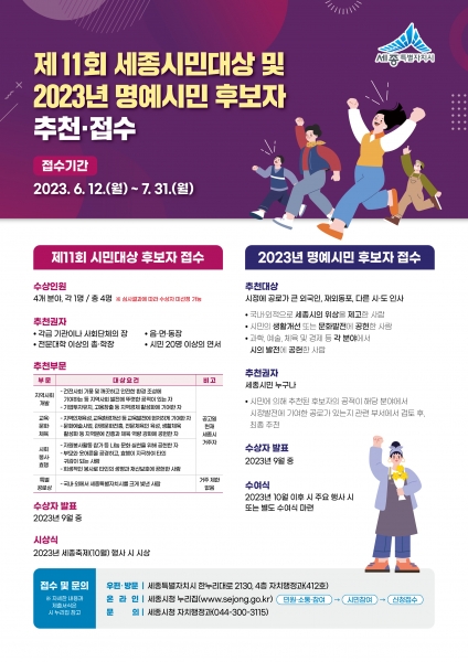 시는 12일부터 7월 31일까지 ‘제11회 세종시민대상’과 ‘2023년 명예시민’ 수상 후보자를 접수한다.