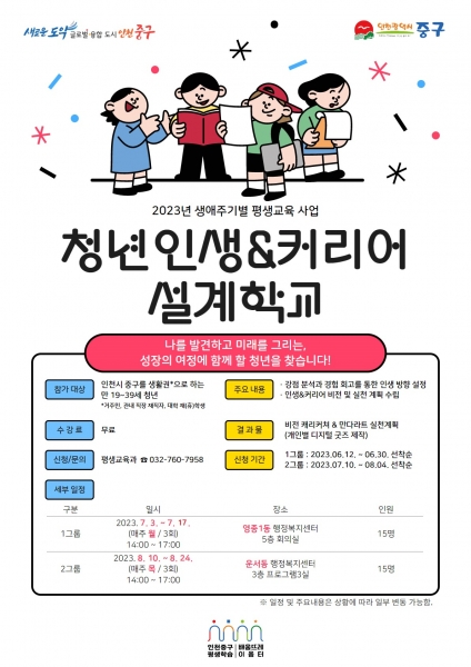 [금요저널] 인천시 중구는 오는 7월과 8월, 청년의 강점을 바탕으로 한 평생교육 ‘청년 인생·커리어 설계학교’를 운영한다고 12일 밝혔다.