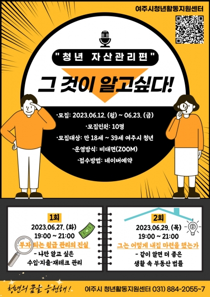 [금요저널] 여주시 청년활동지원센터는 6월, 여주시 청년들을 위한 ‘그것이 알고 싶다, 청년자산관리’ 프로그램을 진행한다고 밝혔다.