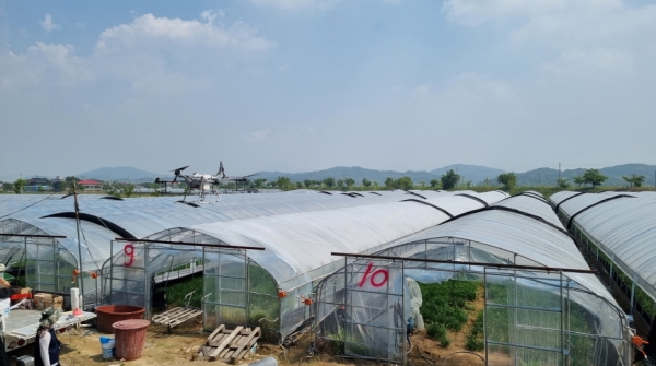 이번 기술보급은 ‘이상기상 대응 원예작물 안정생산 기술 시범사업’의 일환으로 추진됐으며 드론을 이용한 차광도포제 도포 및 차광막 설치가 주 내용이다.