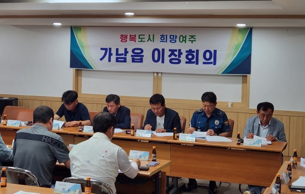 이 날 이장회의에 앞서 6월 호국보훈의 달을 맞아 순국선열과 호국영령에 대한 묵념 시간을 가졌으며 2023년 가남읍 주민총회, 경로당 한방·구강 이동진료 ‘마주보고’ 사업, 생태계 교란 외래식물 제거사업, 주민등록증 무료 재발급, 백내장 수술 지원, 여름방학 대학생 직무체험 아르바이트 대상자 모집, 미등록 지하수 시설 전수조사, 여름철 시설하우스·과수원 재해예방 홍보 및 사전점검, 2023년도 하반기 귀농 농업창업 및 주택구입 지원사업, 농민기본소득 지원사업 2차 신청 접수, 당면 영농사항 등 시·읍정 사항을 안내했다.