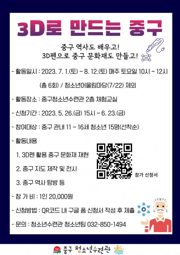 신청 방법은 중구청소년수련관 홈페이지에 게시된 일정을 확인해 별도 QR코드로 신청하면 된다.