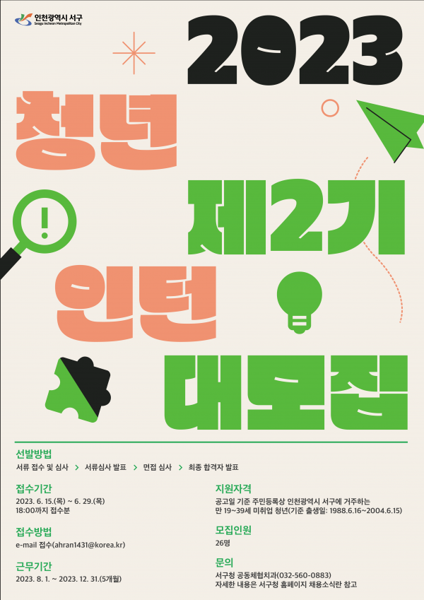 [금요저널] 인천 서구가 미취업 청년의 역량 강화와 취업을 위한 ‘2023년 제2기 취업성공 디딤돌 청년인턴 사업’을 추진하고 오는 29일까지 참가자를 모집한다고 밝혔다.