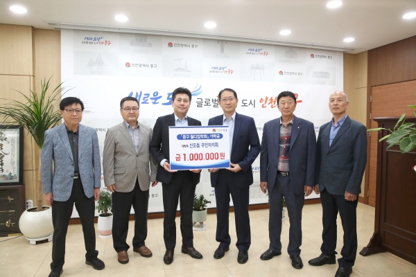 지난 19일 중구청 구청장실에서 열린 기탁식에는 김정헌 중구청장, 신포동 주민자치회의 김관섭 회장, 김종순 부회장, 황혜숙 부회장, 류호근 감사, 송미숙 재무간사, 윤희정 간사가 참여했다.