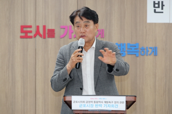 [금요저널] 군포시는 의회 다수당인 야당의원들의 일방추진으로 20일 통과된 ‘금정역 통합역사 개발촉구결의안’에 대해 ‘진행중인 사업에 힘빼기를 하고 있다’고 유감의 뜻을 발표했다.