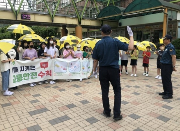 이날 캠페인에서는 청학초등학교 학생들에게 무단 횡단 절대 안 하기 보행 중 스마트폰 사용 안 하기 횡단보도 건널 때 좌우 살피기 등 교통안전 수칙을 안내하고 홍보 물품으로 제작된 어린이 안전 우산 100여 개를 배부했다.