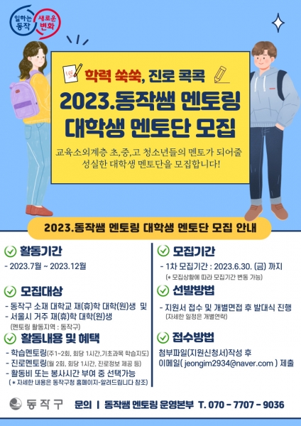[금요저널] 동작구가 교육취약계층의 학습격차 해소를 위한 ‘학력 쑥쑥, 진로 콕콕 2023 동작쌤 멘토링’을 7월부터 운영한다고 22일 밝혔다.