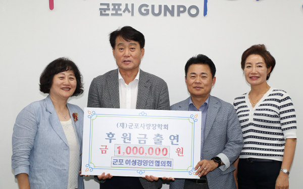 [금요저널] 군포여성경영인협의회에서 장학금 100만원을 미래의 주역인 청소년들을 위해 써달라며 군포사랑장학회에 기탁했다6월 21일 군포시장실에서 출연식을 진행했으며 군포여성경영인협의회는 군포시 관내 청소년들이 경제적인 어려움으로 학업을 중단하는 일이 없도록 2007년부터 꾸준히 정기 후원을 이어오고 있으며 지금까지의 장학금 기부 누적액은 1,500만원이다.