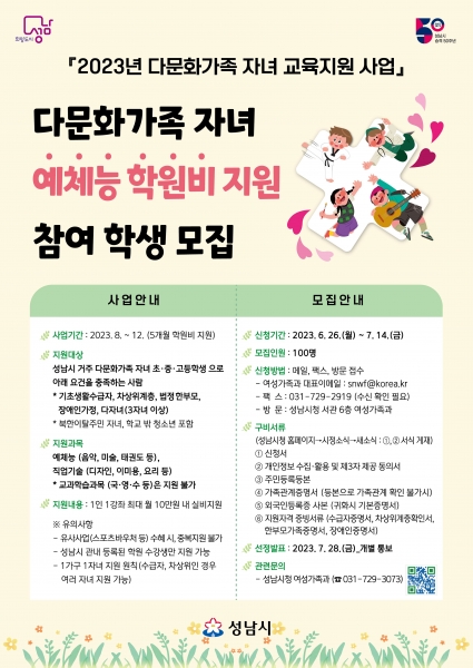 [금요저널] 성남시는 다문화가족 자녀에 오는 8월부터 연말까지 5개월간 월 최대 10만원의 예체능 학원비를 지원한다고 26일 밝혔다.