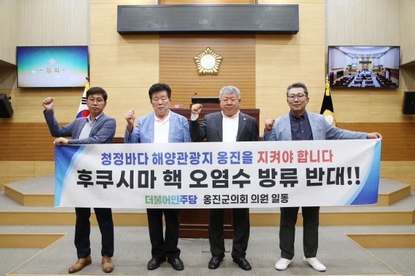 더불어민주당 의원 일동은 결의문에서 “방류된 오염수로인한 해양생태계와 수산업에 막대한 피해가 예상되어 우리 바다 수산물 먹거리 안전과 소비위축으로 국민경제와 해양환경에 중대한 손상을 초래할 수 있으며 서해에 청정섬들로 이루어진 우리 옹진군의 피해는 더욱 크다”며 “백령면의 천연기념물인 사곳해수욕장, 점박이물범의 서식지, 대청면 해안사구, 영흥·북도면의 갯벌은 유네스코 등재를 추진할 만큼 자연적 가치가 상당하고 연평도의 꽃게, 덕적·자월의 연안어장 등 청정해역에서 생산되는 풍부한 해산물은 오염수 방류가 시작되면 각종 방사성 오염물질로 인해 본래의 가치를 잃을 것이며 우리 옹진군에서 바다를 삶의 터전으로 삼아온 우리 군민들이 입을 피해와 미래 세대에 미치는 악영향은 명약관화할 것이다”고 규탄했다.