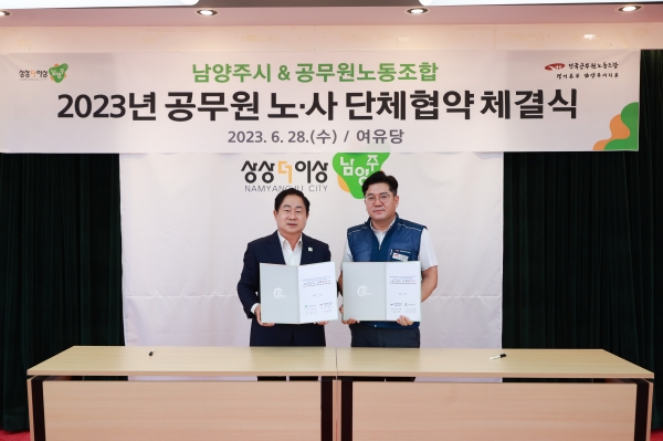 [금요저널] 남양주시는 28일 시청 여유당에서 전국공무원노동조합 경기지역본부 남양주시지부와 공무원 노·사 단체 협약을 체결했다.