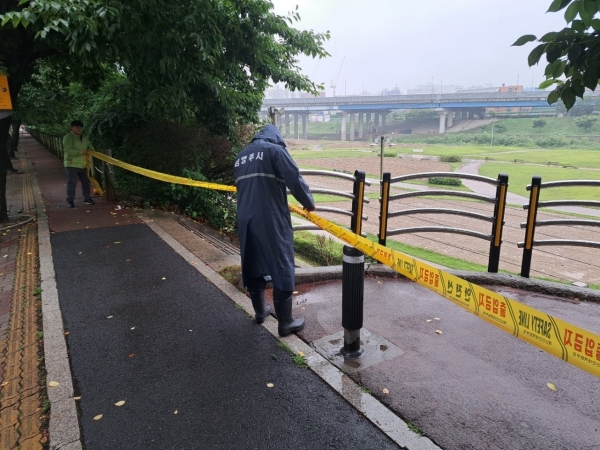 또한, 시는 재난상황실 CCTV 및 예·경보 시스템을 활용해 하천 수위를 모니터링하며 세월교, 하천 산책로 등을 통제하고 ‘외출 자제 및 위험 지역 접근 금지’를 안내하는 재난 문자 발송과 도로 전광판 40개소에 ‘낙뢰 및 국지성 호우에 따른 실내 이동’을 홍보하는 등 집중 호우에 적극 대응하고 있다.