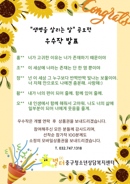 공모전은 5월 26일에서 6월 9일까지 2주간 ‘생명의 소중함을 느끼도록 해 주는 말’을 주제로 온라인으로 진행됐다.