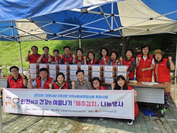 [금요저널] 군포시 군포2동 지역사회보장협의체는 7월 6일 ‘희망나눔 군포2동’특화사업으로 기후변화 대응이 어렵고 건강관리에 취약한 저소득층을 대상으로 안전하고 건강하게 여름을 날 수 있는 ‘김치’ 나눔행사를 가졌다.