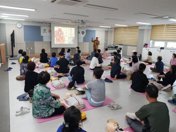 이날 교육은 2부로 나눠 진행됐으며 1부에서는 남양주시 자율방재단장이 강의를 맡아 물놀이 사고 등으로 인한 응급상황 발생 시 심정지 골든타임 안에 조치할 수 있는 흉부 압박 및 제세동기 작동 방법 등 심폐소생술에 대한 교육을 진행했다.