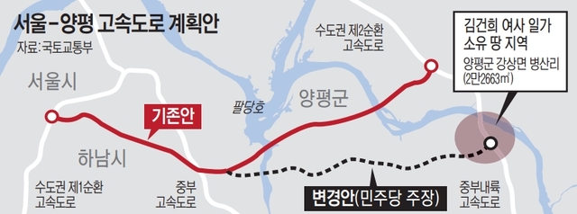 한편, 더불어민주당은 서울~양평 고속도로 종점이 양서면에서 김건희 여사 일가가 보유한 2만2663㎡ 땅 인근인 강상면으로 변경하는 계획을 검토했다며 의혹을 제기하고 연일 공세를 펴고 있다.