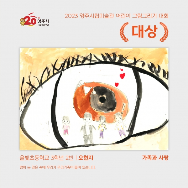 초등학교 저학년 부분 대상 수상자 오현지 학생은 ‘가족과 사랑’이라는 제목으로 언제나 사랑으로 가족을 아끼는 ‘엄마의 눈 깊숙이 가족이 들어있는’ 모습을 독창적으로 표현했으며 고학년 부분 대상 수상자 류가현 학생은 가족을 항상 따뜻하게 감싸주는 이불로 표현하고 그 안에서 가족이 함께 만든 즐거운 추억을 그렸다.