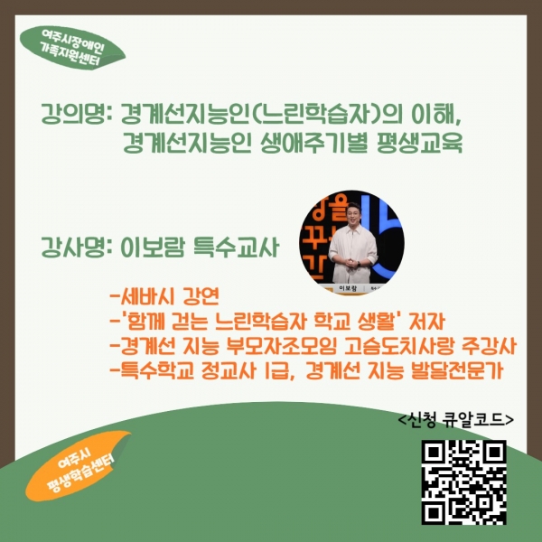 이번 간담회는 강의와 토론회 형태로 진행되며 강의를 맡은 이보람 특수교사는 '함께 걷는 느린 학습자 학교생활'의 저자이며 세바시 강연을 하는 등 경계선지능인 분야의 전문가로 여주시 경계선지능인 평생교육 지원사업의 방향에 길잡이가 될 예정이다.