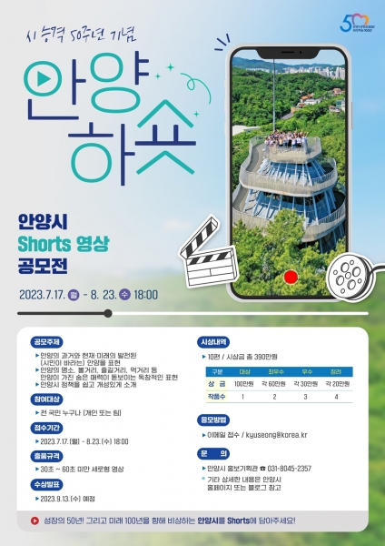 최대호 안양시장은 “시 승격 50주년을 기념해 미디어 트렌드에 맞춰 세로형의 숏츠 영상으로 공모하게 됐다”며 “안양의 매력을 널리 알릴 수 있는 독창적인 아이디어가 담긴 영상들이 많이 접수되길 기대한다”고 말했다.