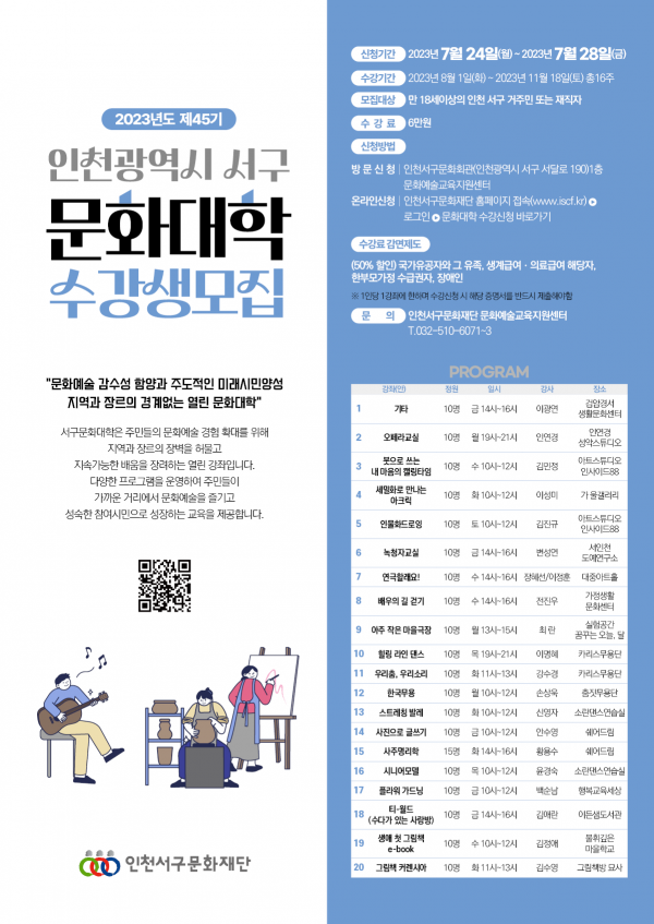 [금요저널] 서구문화재단이 오는 24일부터 28일까지 총 20개 강좌에서 ‘서구 문화대학’ 하반기 수강생을 모집한다.