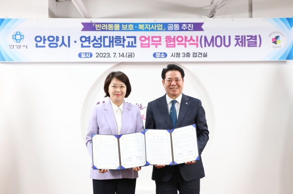 [금요저널] 안양시가 14일 사람과 동물이 행복하게 공존하는 도시 조성을 위해 연성대학교와 ‘반려동물 보호·복지사업’ 업무협약을 체결했다.