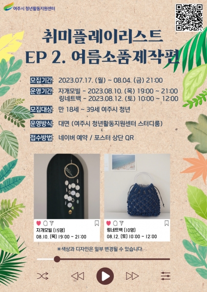 ‘취·플·리’ 2편 여름소품제작 프로그램에 대한 자세한 사항은 여주시 청년활동지원센터 홈페이지를 통해 확인할 수 있다.