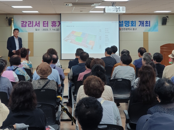 [금요저널] 인천시 중구는 지난 14일 오후 동인천동 행정복지센터 다목적 회의실에서 ‘감리서 터 휴게쉼터 조성사업 주민설명회’를 개최했다.