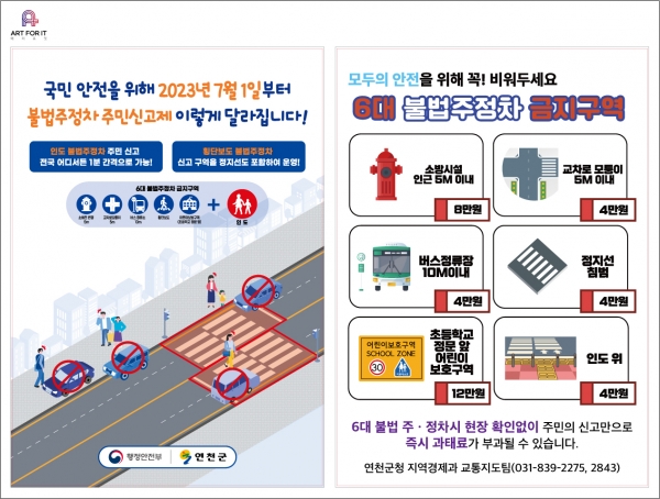[금요저널] 연천군은 행정안전부의 제도 개선에 따라 8월 1일부터 ‘불법 주정차 주민신고제’ 기준을 변경, 주·정차 금지구역을 기존 5곳에서 6곳으로 확대 운영한다고 18일 밝혔다.