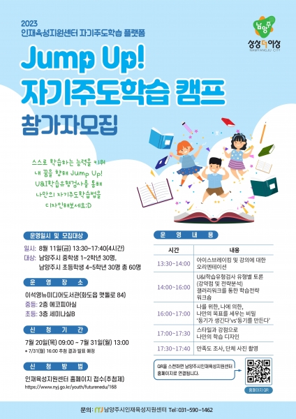 [금요저널] 남양주시는 오는 31일까지 관내 초등학생 및 중학생을 대상으로‘Jump up 자기주도학습 캠프’참여자 60명을 모집한다고 20일 밝혔다.