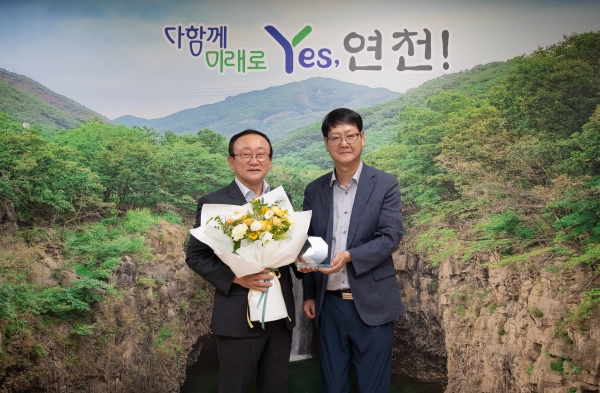 이날 김상갑 국민건강보험공단 동두천연천지사장이 연천군청을 방문, 김덕현 연천군수에게 감사패를 전달했다.