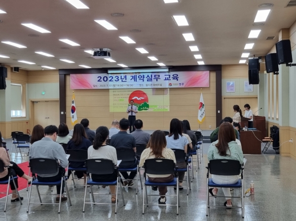 [금요저널] 인천시 중구는 지난 17일 중구청 월디관에서 계약업무 담당 공무원 등 60여명을 대상으로 2023년도 계약실무교육을 실시했다.