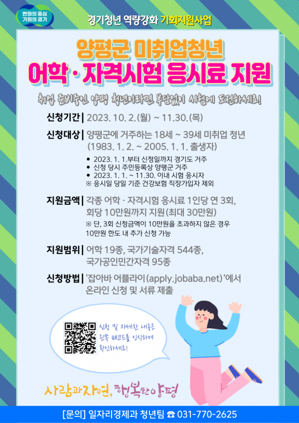 양평군 미취업 청년 어학 및 자격시험 응시료 지원 사업과 양평군 청년정책에 대한 안내는 일자리경제과 청년팀으로 문의하면 된다.