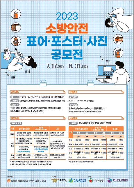 표어·포스터 분야는 올해 공모 주제와 관련해 국민과 공감대를 형성할 수 있는 내용으로 사진 분야는 소방활동 또는 소방안전교육 현장의 재미있고 즐거운 순간을 담으면 된다.
