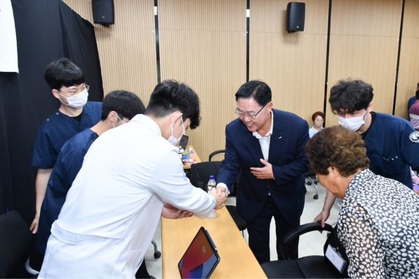 이날 강 시장은 자원봉사자들의 노고를 격려하고 진료 대기중인 어르신들의 안부와 건강을 물었다.