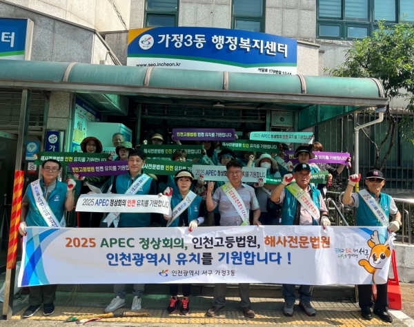 [금요저널] 인천 서구 가정3동 행정복지센터는 지난 21일 가정3동 통장자율회와 함께 7월 클린업데이 환경정비를 하고 이어 ‘2025 APEC 정상회의, 인천고등법원, 해사전문법원 인천 유치’를 위한 지지를 선언했다.