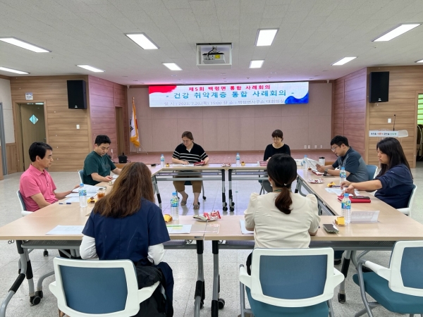 이날 회의는 건강 취약계층 9명의 의료 서비스 연계에 대해 종합적으로 논의하기 위한 자리로 면사무소, 백령종합사회복지관 사례관리 담당자, 백령치매안심센터, 보건소 방문간호사, 노인맞춤돌봄서비스 전담사회복지사 등이 참여했다.