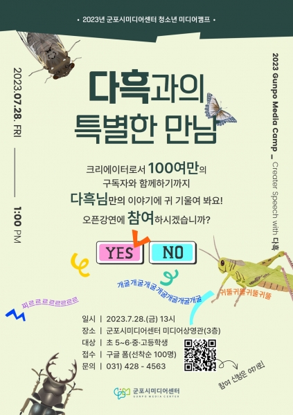 이번 특별 강연은 여름방학을 맞아 관내 청소년을 대상으로 진행하는 ‘2023년 군포시미디어센터 청소년 미디어 캠프’ 중 하나의 프로그램으로 캠프 참가자가 아니더라도 일반 청소년에게도 열려있는 오픈 강연으로 진행한다.