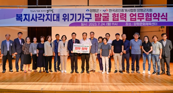 전진선 양평군수는 “이번 업무 협약을 통해 지역 내 복지위기 가구가 선제적으로 발굴될 수 있도록 공인중개사협회의 관심과 협조를 부탁드린다”며 “양평군에서는 주변의 어려운 이웃을 찾아 촘촘한 복지 인적안전망을 구축해 위기 가구를 조속히 발굴하고 지원하는 데 최선을 다하겠다”고 전했다.
