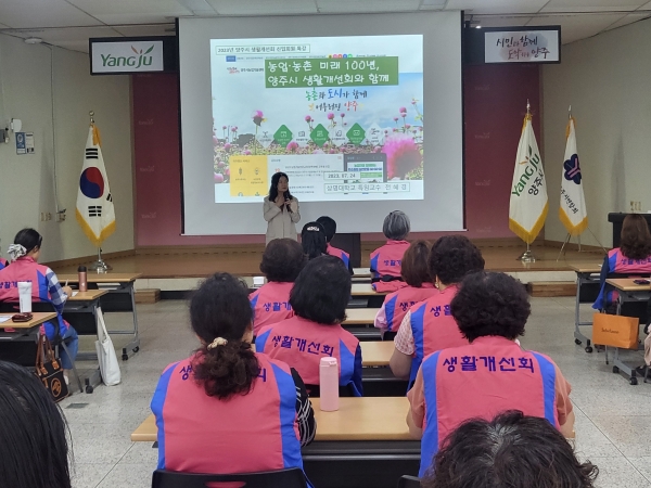 이날 교육은 생활개선회원 신입회원을 비롯한 33여명의 회원이 함께하며 ‘농업·농촌 미래 100년, 양주시생활개선회와 함께’라는 주제로 前농촌진흥청 국립농업과학원장을 역임하셨던 상명대학교 전혜경 특임교수의 특강으로 진행했다.