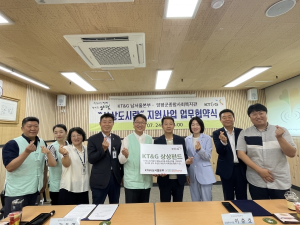 협약식에는 이춘호 KT&G 남양주지사장, 한호성 시장관리 차장, 이혜원 경기도의회 의원, 박대식 양평군청 복지정책과장, 강동연 양평군종합사회복지관장이 참석했다.