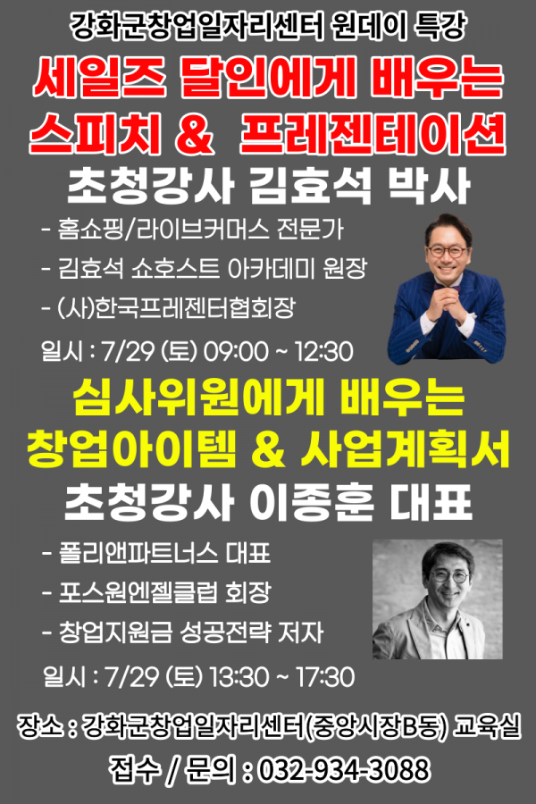 오전에는 ‘세일즈 달인에게 배우는 스피치 & 프레젠테이션’ 특강을, 오후에는 ‘심사위원에게 배우는 창업아이템&사업계획서’를 강의한다.