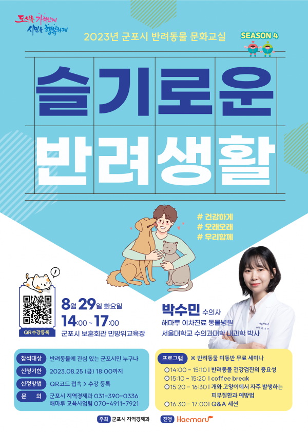 [금요저널] 군포시는 올바른 반려동물 문화 정착을 위해 8월 29일 화요일 오후 2시부터 5시까지 3시간 동안 군포시 보훈회관 민방위교육장에서 ‘슬기로운 반려생활 시즌4’를 개최한다.