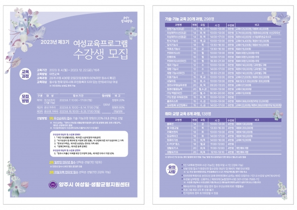양주시 여성일·생활균형지원센터, 제3기 여성교육프로그램 수강생 모집