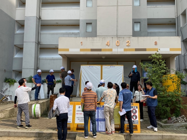 [금요저널] 과천시 시민 석면감시단이 오는 8월 1일부터 시작되는 과천주공4단지 석면 해체·제거 작업에 앞서 31일 비닐 보양 상태를 확인하는 등 현장을 점검했다.